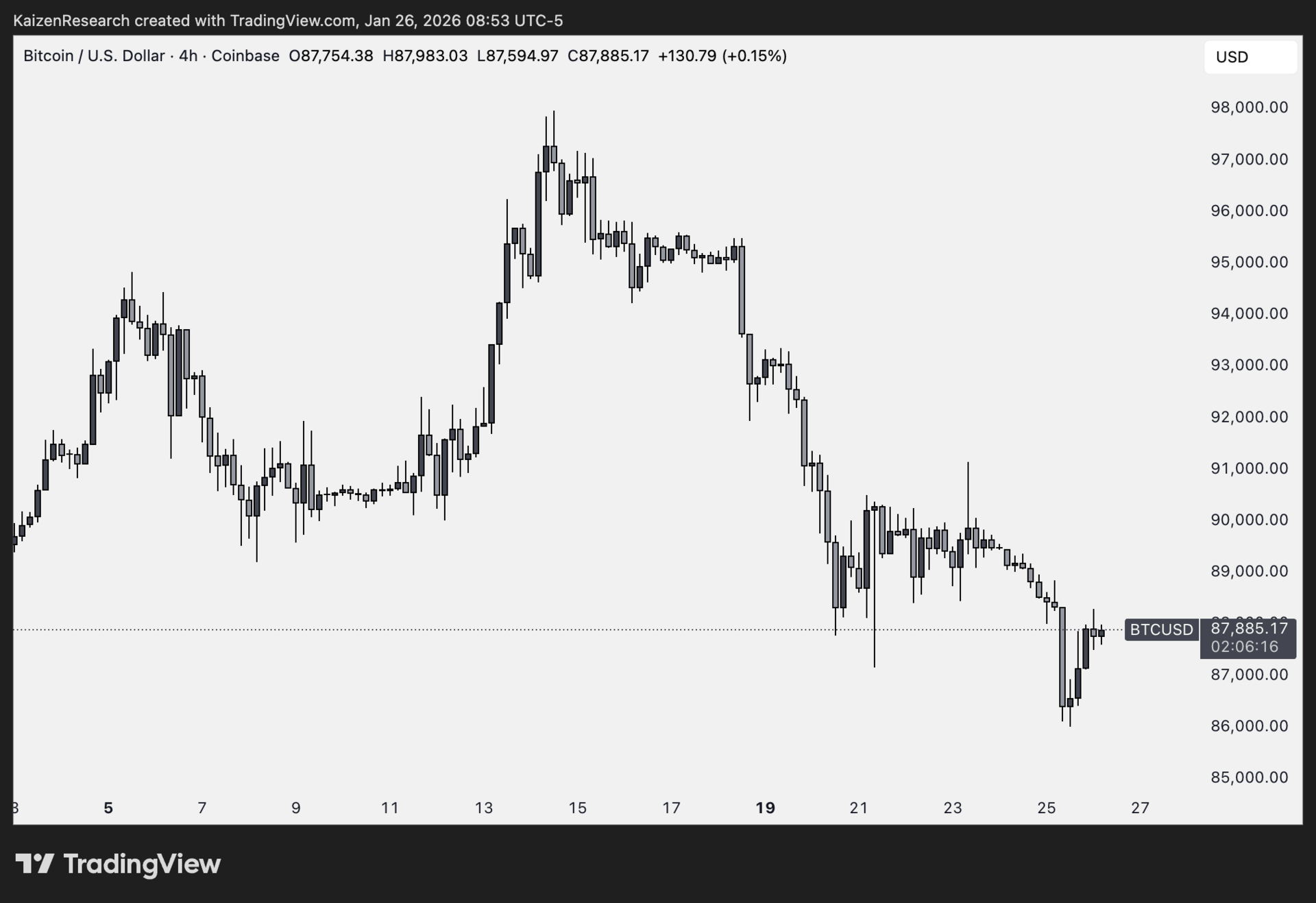 BTC briefly slid to just above $86K, its lowest level this year, before stabilizing near $87.8K. ETH took a harder hit, dropping nearly 6% at the lows and still hovering near its weakest levels since mid-December.