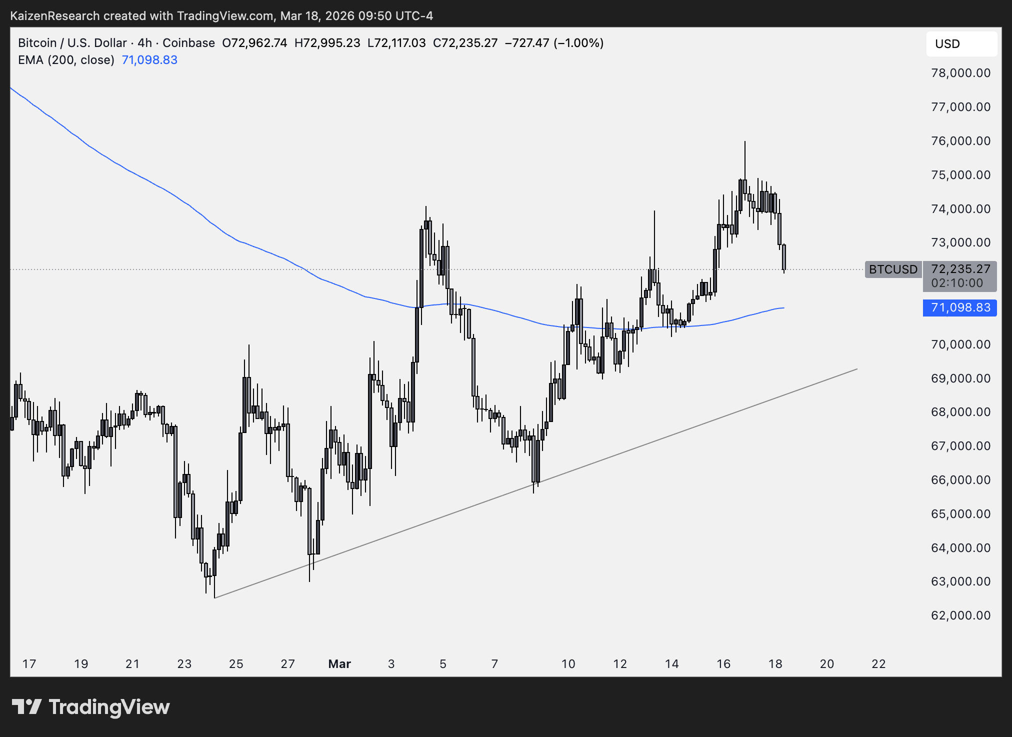 BTC is holding above the 4H EMA200 after a strong push higher, now consolidating near $72K.