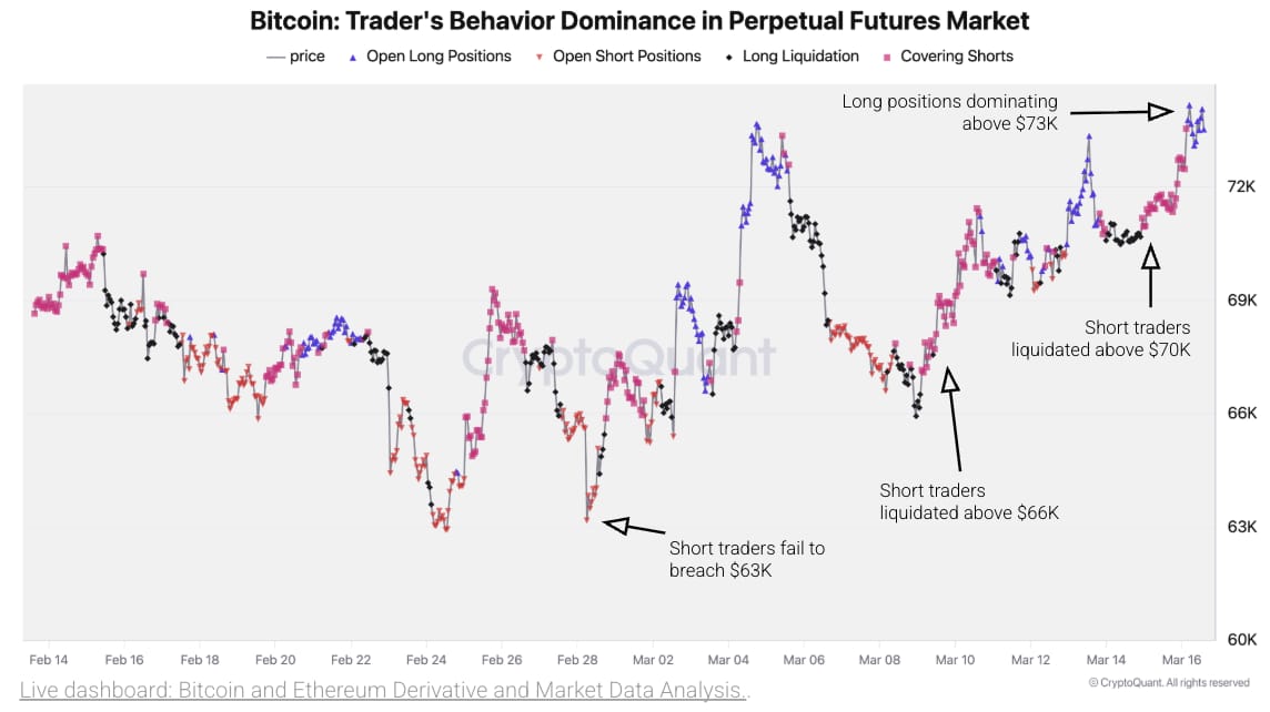 Shorts were liquidated above $70K, and new longs opened around $73K, signaling expectations for near-term upside.
