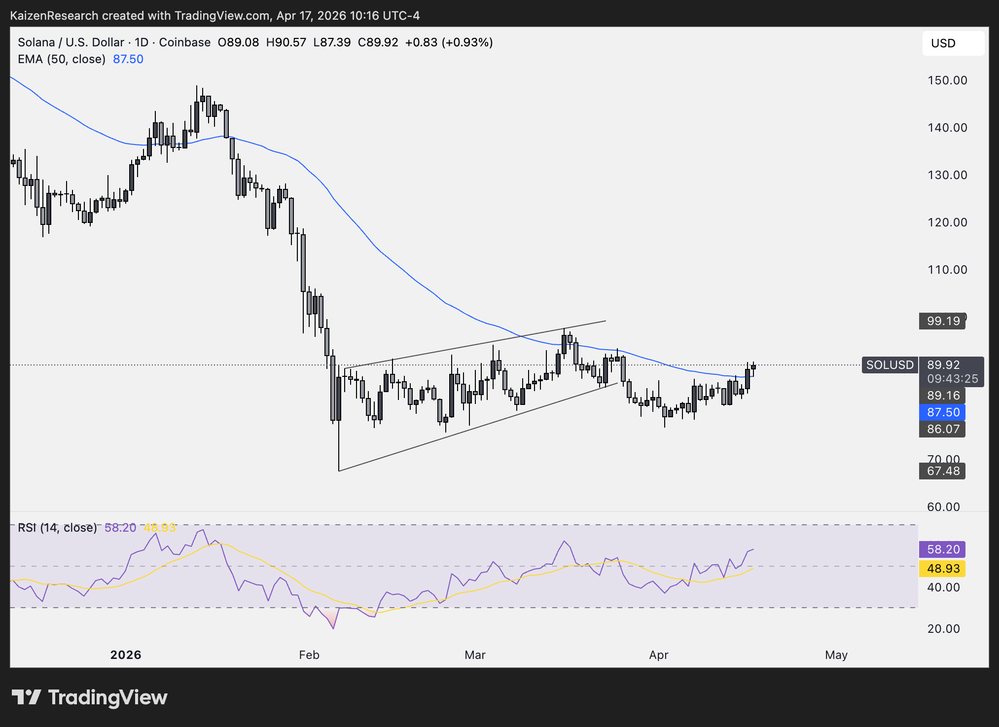 At the same time, SOL is still pushing through the 50-day EMA, and RSI is around the midline, keeping things neutral for now.