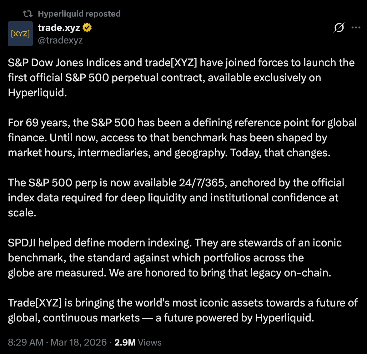Trade[XYZ] secured a licensing agreement with S&P Dow Jones Indices to list the contracts, settling in USDC and trading 24/7.
