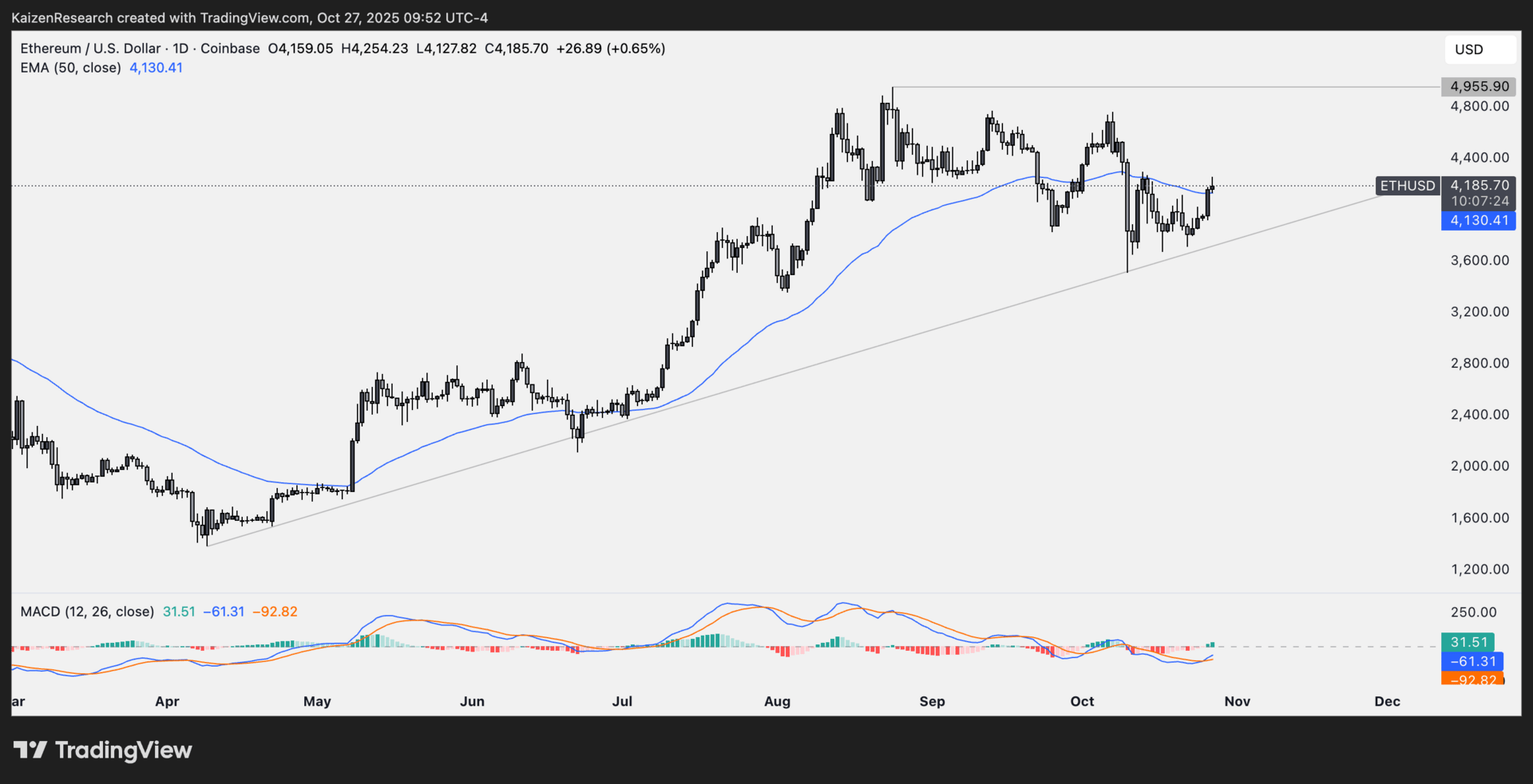 Ethereum (ETH) climbed back above $4,100