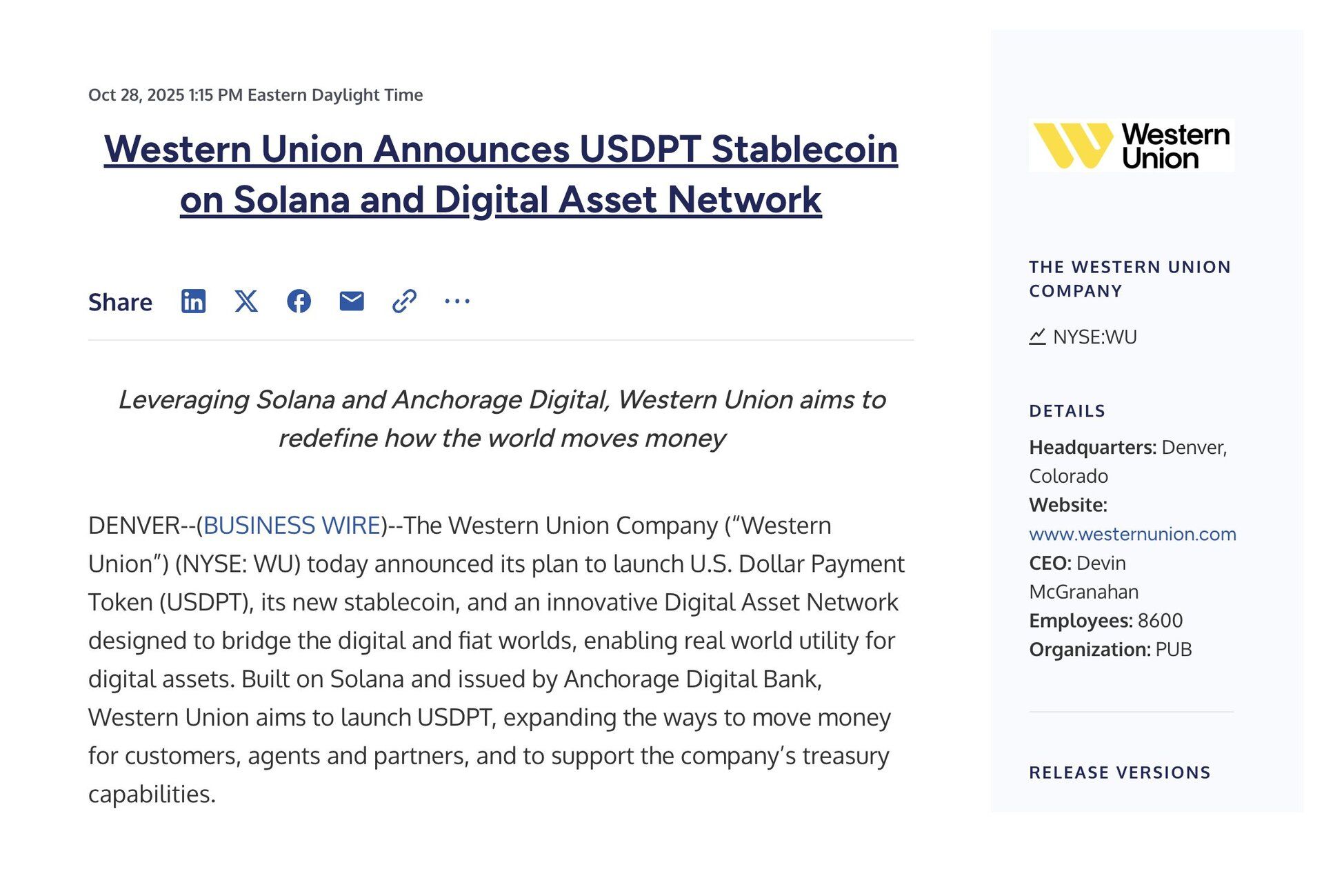 Western Union just made its biggest leap in 175 years, it’s building a stablecoin on Solana.