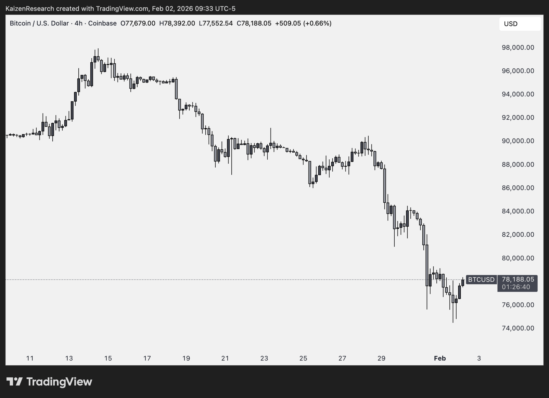 Bitcoin fell 7%+ over the weekend, dropping from ~$84K to $75.5K before bouncing near $78K. The move pushed BTC below its True Market Mean ($80.5K) for the first time in ~30 months.